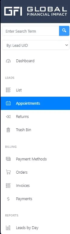 Search by date range, Lead Type (from the dropdown), or search across all Leads.