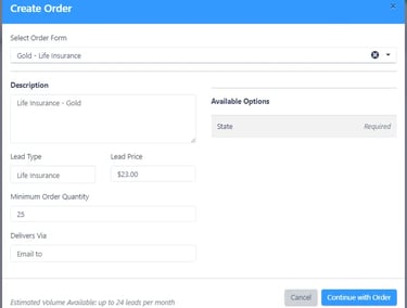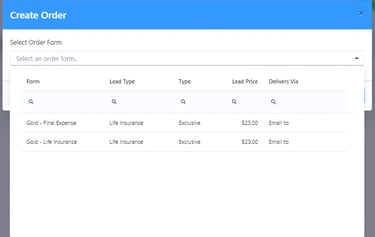 Click the + New button in the top-left corner. You’ll see a list of Order Forms showing details such as the Lead Type, price per Lead, and delivery method.