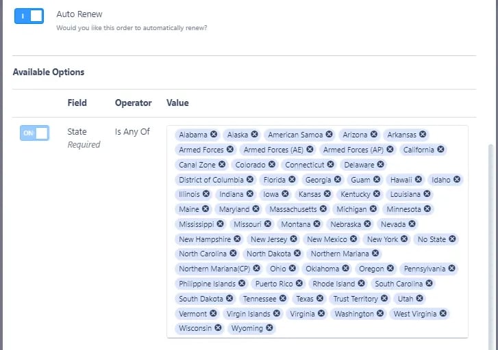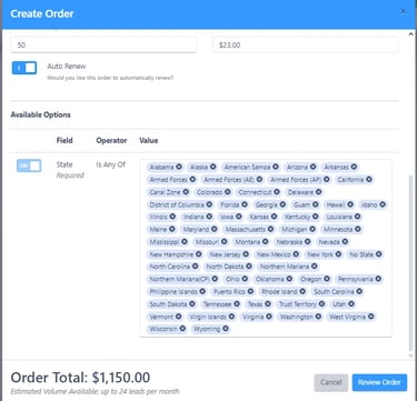 Adjust the number of leads you'd like to purchase (note that you cannot order below the minimum quantity) and choose the States from which you want to receive leads.