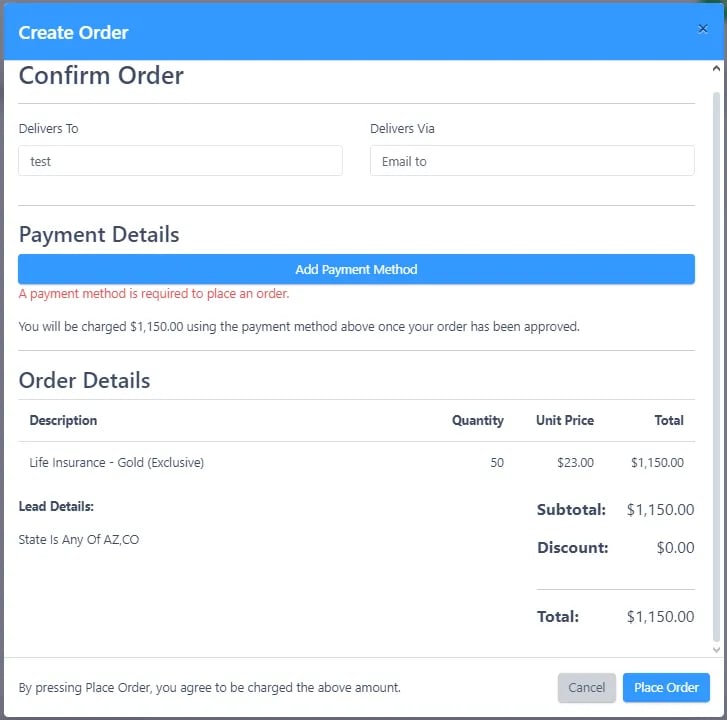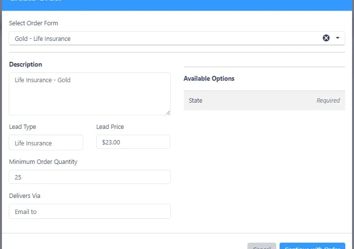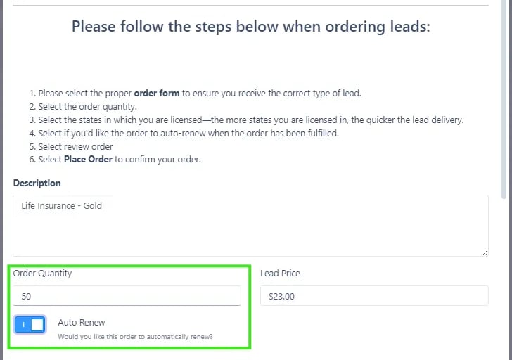 All other lead types (Gold Life Insurance, Spanish Life Insurance, etc.) are delivered in real time. As soon as a prospect completes the form on the website, the lead is automatically sent to your account. These lead types will typically be delivered within a week. If your leads are taking longer to receive, it is likely because your order includes only one state. I think the best practice is to include multiple state licenses on your orders to ensure you receive your leads as soon as possible.